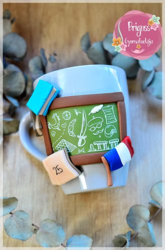 Ez a bögre egy egyedi, kézzel készült díszítést kap, amely egy krétatáblára emlékeztet, és az ajándékozott tantárgyához igazodik. A táblára gyurmából megformázva kerülnek fel a tantárgyhoz kapcsolódó motívumok, mintha krétával lennének rajzolva. A bögre körüli díszítés is az adott szakterülethez illeszkedik, így igazán személyre szabott és egyedi ajándék készül!
